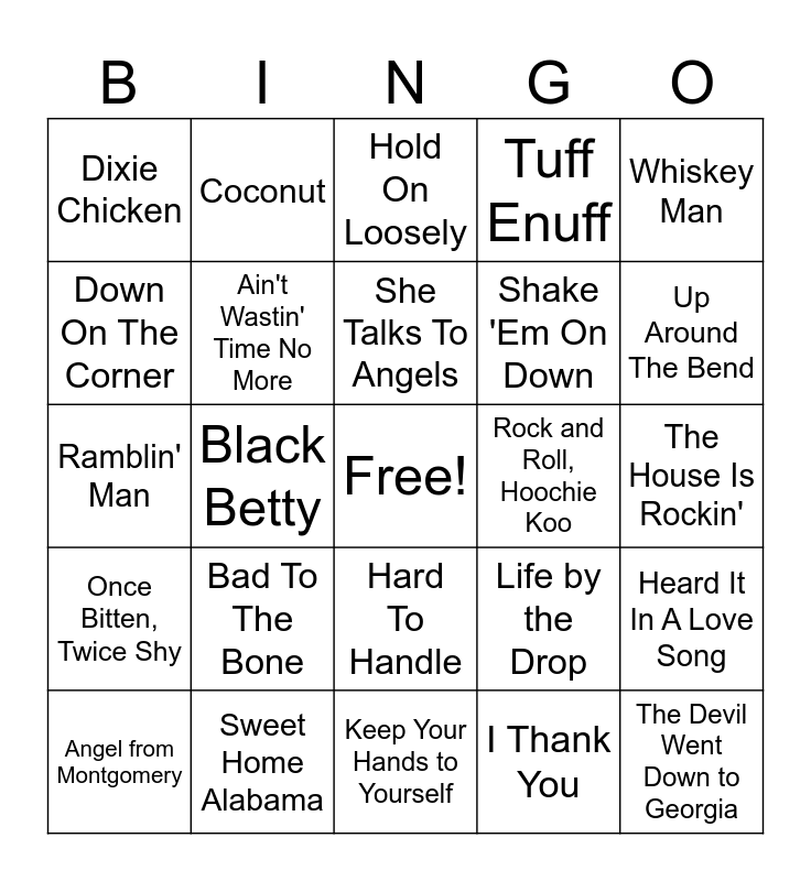 This bingo card has a free space and 41 words: Mississippi Queen, Ramblin' Man, Blue Sky, Ain't Wastin' Time No More, Sweet Home Alabama, Hard To Handle, She Talks To Angels, Flirtin' with Disaster, Whiskey Man, Once Bitten, Twice Shy, Black Betty, Tuff Enuff, The Devil Went Down to Georgia, The House Is Rockin', Rock and Roll, Hoochie Koo, Bad To The Bone, There Goes Another Love Song, Dixie Chicken, Caught Up In You, Hold On Loosely, Heard It In A Love Song, I'm No Angel, Keep Your Hands to Yourself, Shake 'Em On Down, Her Strut, Move It On Over, I Thank You, Amie, Up Around The Bend, Always Alright, The Devil Went Down to Georgia, Coconut, Angel from Montgomery, Wrap It Up, Life by the Drop, Down On The Corner, Twice As Hard, Heard It in a Love Song, La Grange, Can't Let Go and Joy.