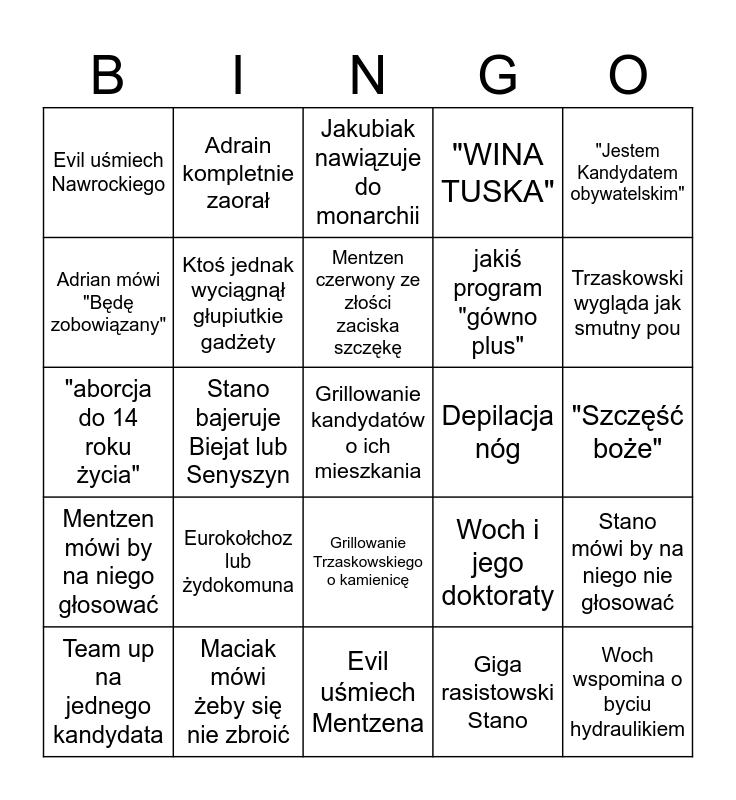 This bingo card has a free space and 24 words: Eurokołchoz lub żydokomuna, Maciak mówi żeby się nie zbroić, Mentzen czerwony ze złości zaciska szczękę, Team up na jednego kandydata, "Jestem Kandydatem obywatelskim", Evil uśmiech Nawrockiego, Adrian mówi "Będę zobowiązany", Adrain kompletnie zaorał, Depilacja nóg, Grillowanie Trzaskowskiego o kamienicę, jakiś program "gówno plus", "aborcja do 14 roku życia", Woch i jego doktoraty, Stano mówi by na niego nie głosować, Ktoś jednak wyciągnął głupiutkie gadżety, Giga rasistowski Stano, "Szczęść boże", Jakubiak nawiązuje do monarchii, Trzaskowski wygląda jak smutny pou, Stano bajeruje Biejat lub Senyszyn, Woch wspomina o byciu hydraulikiem, Mentzen mówi by na niego głosować, "WINA TUSKA" and Evil uśmiech Mentzena.