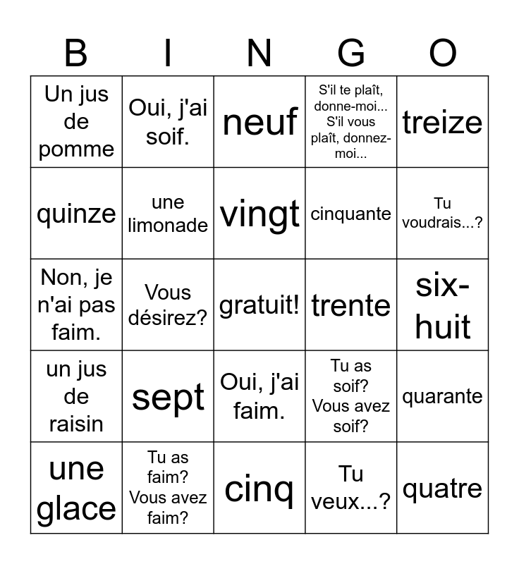 This bingo card has a free space and 24 words: sept, Tu as faim? Vous avez faim?, vingt, une glace, treize, Un jus de pomme, quinze, Oui, j'ai soif., trente, Oui, j'ai faim., cinquante, Non, je n'ai pas faim., Tu as soif? Vous avez soif?, quarante, une limonade, Tu veux...?, six-huit, neuf, Tu voudrais...?, Vous désirez?, quatre, un jus de raisin, S'il te plaît, donne-moi... S'il vous plaît, donnez-moi... and cinq.