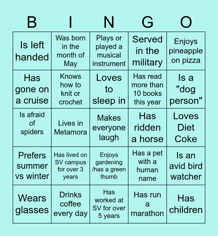 This bingo card has a free space and 24 words: Has lived on SV campus for over 3 years, Drinks coffee every day, Loves to sleep in, Wears glasses, Enjoys pineapple on pizza, Is left handed, Has gone on a cruise, Was born in the month of May, Has ridden a horse, Enjoys gardening /has a green thumb, Has read more than 10 books this year, Is afraid of spiders, Has a pet with a human name, Is an avid bird watcher, Knows how to knit or crochet, Has run a marathon, Loves Diet Coke, Plays or played a musical instrument, Is a "dog person", Lives in Metamora, Has children, Prefers summer vs winter, Served in the military and Has worked at SV for over 5 years.