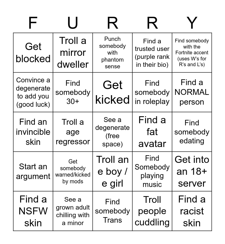 This bingo card has a free space and 24 words: Get somebody warned/kicked by mods, See a grown adult chilling with a minor, Get kicked, Find a NSFW skin, Find somebody with the Fortnite accent (uses W’s for R’s and L’s), Get blocked, Convince a degenerate to add you (good luck), Troll a mirror dweller, Find a fat avatar, Troll an e boy / e girl, Find somebody in roleplay, Find an invincible skin, Find Somebody playing music, Get into an 18+ server, Find somebody 30+, Troll people cuddling, Find somebody edating, Punch somebody with phantom sense, Find a NORMAL person, Troll a age regressor, Find a racist skin, Start an argument, Find a trusted user (purple rank in their bio) and Find somebody Trans.