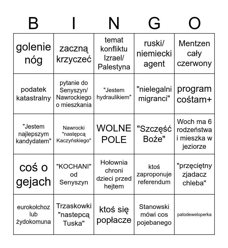 This bingo card has a free space and 24 words: "KOCHANI" od Senyszyn, Trzaskowki "nastepcą Tuska", "Jestem hydraulikiem", eurokołchoz lub żydokomuna, Mentzen cały czerwony, golenie nóg, podatek katastralny, zaczną krzyczeć, "Szczęść Boże", Hołownia chroni dzieci przed hejtem, "nielegalni migranci", "Jestem najlepszym kandydatem", ktoś zaproponuje referendum, "przęciętny zjadacz chleba", pytanie do Senyszyn/ Nawrockiego o mieszkania, Stanowski mówi cos pojebanego, Woch ma 6 rodzeństwa i mieszka w jeziorze, temat konfliktu Izrael/ Palestyna, program cośtam+, Nawrocki "następcą Kaczyńskiego", patodeweloperka, coś o gejach, ruski/ niemiecki agent and ktoś się popłacze.
