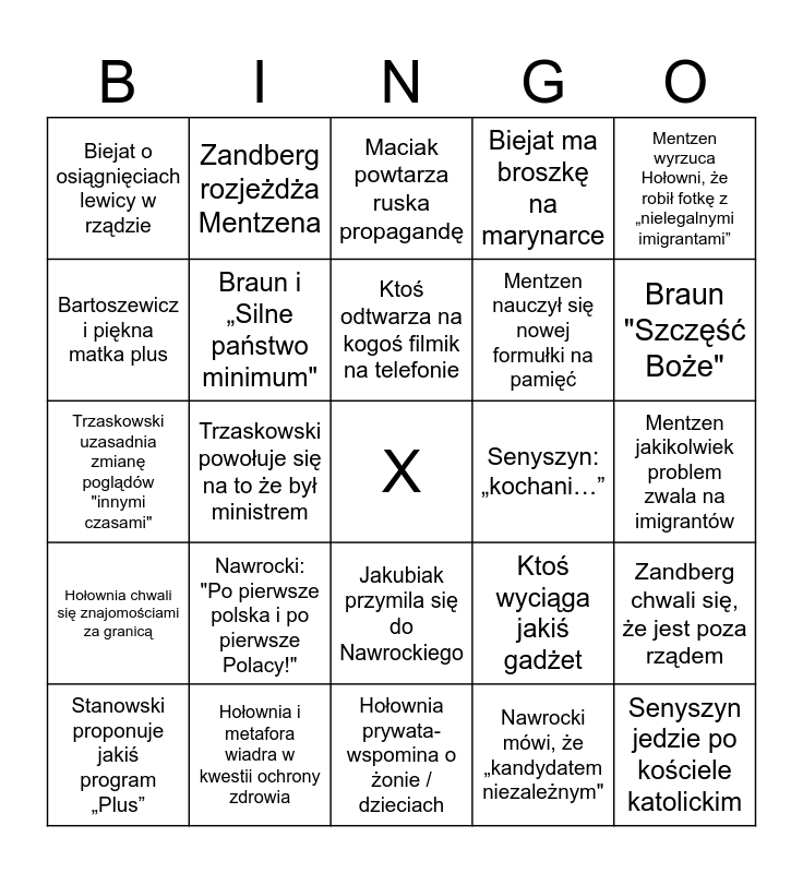 This bingo card has a free space and 24 words: Nawrocki: "Po pierwsze polska i po pierwsze Polacy!", Hołownia i metafora wiadra w kwestii ochrony zdrowia, Ktoś odtwarza na kogoś filmik na telefonie, Stanowski proponuje jakiś program „Plus”, Mentzen wyrzuca Hołowni, że robił fotkę z „nielegalnymi imigrantami”, Biejat o osiągnięciach lewicy w rządzie, Bartoszewicz i piękna matka plus, Zandberg rozjeżdża Mentzena, Senyszyn: „kochani…”, Jakubiak przymila się do Nawrockiego, Mentzen nauczył się nowej formułki na pamięć, Trzaskowski uzasadnia zmianę poglądów "innymi czasami", Ktoś wyciąga jakiś gadżet, Zandberg chwali się, że jest poza rządem, Braun i „Silne państwo minimum", Nawrocki mówi, że „kandydatem niezależnym", Mentzen jakikolwiek problem zwala na imigrantów, Maciak powtarza ruska propagandę, Braun "Szczęść Boże", Trzaskowski powołuje się na to że był ministrem, Senyszyn jedzie po kościele katolickim, Hołownia chwali się znajomościami za granicą, Biejat ma broszkę na marynarce and Hołownia prywata- wspomina o żonie / dzieciach.