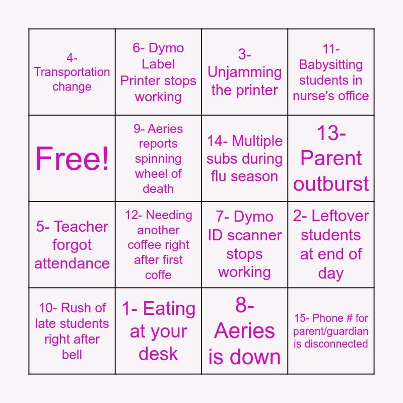This bingo card has 16 words: 1- Eating at your desk, 2- Leftover students at end of day, 3- Unjamming the printer, 4- Transportation change, 5- Teacher forgot attendance, 6- Dymo Label Printer stops working, 7- Dymo ID scanner stops working, 8- Aeries is down, Free!, 9- Aeries reports spinning wheel of death, 10- Rush of late students right after bell, 11- Babysitting students in nurse's office, 12- Needing another coffee right after first coffe, 13- Parent outburst, 14- Multiple subs during flu season and 15- Phone # for parent/guardian is disconnected.
