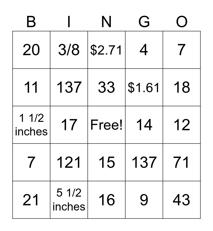 This bingo card has a free space and 37 words: 98, 59, 109, 137, 71, 121, 33, 145, 7, 37, 17, 4, 43, 12, 11, 7, $2.28, $2.71, 15, 14, 20, 18, 21, 16, 0, 9, 3/8, 2/5, 332, 1/2, 10 1/2 inches, 5 1/2 inches, 1 1/2 inches, 223, 137, $1.61 and $2.09.