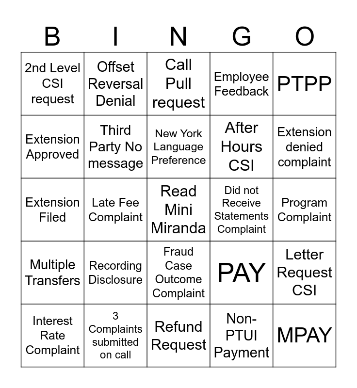 This bingo card has a free space and 24 words: Recording Disclosure, 3 Complaints submitted on call, New York Language Preference, Interest Rate Complaint, PTPP, 2nd Level CSI request, Extension Approved, Offset Reversal Denial, Did not Receive Statements Complaint, Fraud Case Outcome Complaint, After Hours CSI, Extension Filed, PAY, Letter Request CSI, Third Party No message, Non-PTUI Payment, Program Complaint, Call Pull request, Extension denied complaint, Late Fee Complaint, MPAY, Multiple Transfers, Employee Feedback and Refund Request.