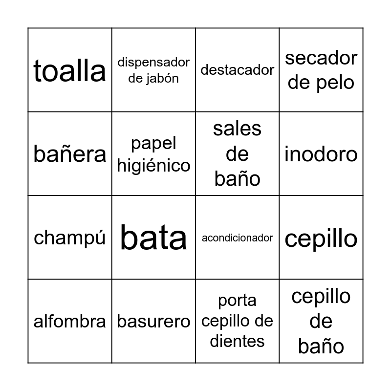 This bingo card has 26 words: lavamanos, grifo, inodoro, ducha, bañera, toalla, papel higiénico, dispensador de jabón, porta cepillo de dientes, jabón, champú, acondicionador, pasta dental, maquinilla de afeitar, cepillo, peine, secador de pelo, cepillo de baño, destacador, alfombra, bata, báscula, basurero, espejo, sales de baño and baño de burbujas.