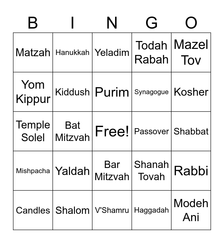 This bingo card has a free space and 43 words: Sh'ma, Modeh Ani, Yeled, Candles, Menorah, Haggadah, Yeladim, Dreidel, Mazel Tov, Shalom, Todah Rabah, Passover, Bar Mitzvah, Yaldah, Torah, V'Shamru, Matzah Ball Soup, Temple Solel, Singing, Kosher, Hanukkah, Fasting, Rosh Hashanah, Matzah, Savta, Shabbat, Shofar, Ima, Shanah Tovah, Mishpacha, Latkes, Rabbi, Praying, Bat Mitzvah, Hebrew, Israel, Judaism, Purim, Yom Kippur, Synagogue, Saba, Kiddush and Abba.