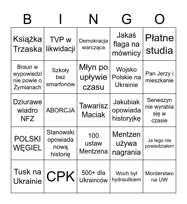 This bingo card has 25 words: Stanowski opowiada nową historię, 500+ dla Ukrainców, Młyn po upływie czasu, Tusk na Ukrainie, Płatne studia, Książka Trzaska, Braun w wypowiedzi nie powie o Żymianach, TVP w likwidacji, Jakubiak opowiada historyjkę, 100 ustaw Mentzena, Wojsko Polskie na Ukrainie, Dziurawe wiadro NFZ, Mentzen używa nagrania, Ja tego nie powiedziałem, Szkoły bez smarfonów, Morderstwo na UW, Seneszyn nie wyrabia się w czasie, Demokracja warcząca, Pan Jerzy i mieszkanie, ABORCJA, Tawarisz Maciak, CPK, POLSKI WĘGIEL, Jakaś flaga na mównicy and Woch był hydraulikiem.