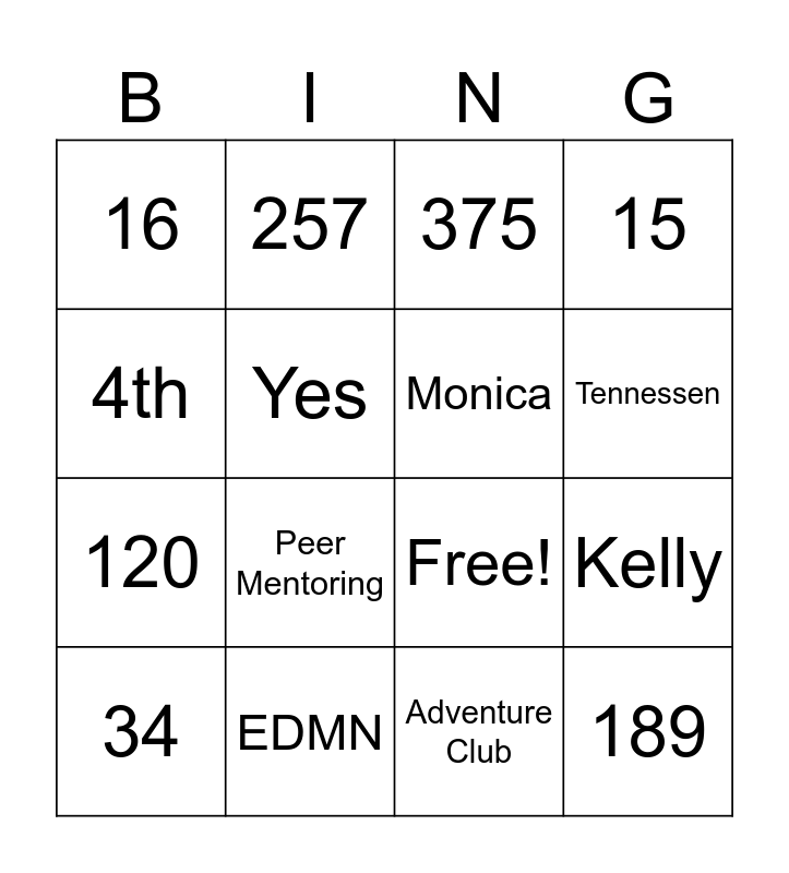 This bingo card has 22 words: EDMN, All 3!, 257, 21, Yes, Monica, 16, 375, Free!, 189, 120, 15, Robert, 1948, Adventure Club, Jody, Kelly, 34, Peer Mentoring, 4th, Tennessen and Summer Leadership Institute.