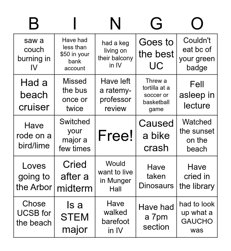 This bingo card has a free space and 83 words: has chanted O-leee Ole Ole O-leee, gau-chos!, went to deltopia, had a keg living on their balcony in IV, Was a gauchoholic, or gaucho loco, fell asleep in a lecture, changed your major MORE than once, Studied at the UCEN, got tar on your feet at the beach, Lived in San Raf, rode Bill's Bus, Lived in Franscisco Torres (FT), Had a pitcher at Sam's TO Go, Missed the bus once or twice, Caused a bike crash, went surfing in college, saw a couch burning in IV, Chose UCSB for the beach, Had a beach cruiser, took sailing as a class, Worked on campus, graduated from best college EVER!, Threw a tortilla at a soccer or basketball game, had to look up what a GAUCHO was, has an alumni license plate frame, Switched your major a few times, Have spotted the "duck couple", Have used covid as an excuse to skip class, Been attacked by birds at the UCen, Submitted an assignment at 11:59pm, 7 is your fav number, Cried after a midterm, Have gone to campus point, Joined Greek Life, Have rode on a bird/lime, Have walked in the skateboard lane, went to office hours, Have walked barefoot in IV, Downloaded a dating app <3, Fell asleep in lecture, Loves going to the Arbor, Have been to a MCC event, Got your bike STOLEN, Took dance 45, had to call the RA bc you got locked out, Have taken a pic of good ol' Storke, Crashed a class and didn't get in. rip., Have had less than $50 in your bank account, Gotten tar on your feet, Settled for getting a D in a class, Sleeps through zoom lectures, Have taken Dinosaurs, Goes to the best UC, Watched the sunset on the beach, Thinks free birds is overrated, Actually likes the taco "pizza", Will be living in IV next year, Drinks too much coffee, Forgot about your passtime, Is a STEM major, Have used the pool this year, Have never bought a textbook, Have experienced Freshman-15, Still talks to your high school friends, Couldn't eat bc of your green badge, Have gotten "the glare" for coughing in class, Have cried in the library, Have lost your access card, Have eaten at Portolla, Is a humanities major, Have had to P/NP a class, Have been surfing, Thinks blenders is better than Jamba juice, Has a job on campus, Would want to live in Munger Hall, Have had a 7pm section, Has had a class in Campbell, Your roommate is you best friend, Have left a ratemy-professor review, You've run away from your RA, You're either from the Bay or LA, Studied at the UCen, Has asked for an extension and Has gotten a parking ticket.