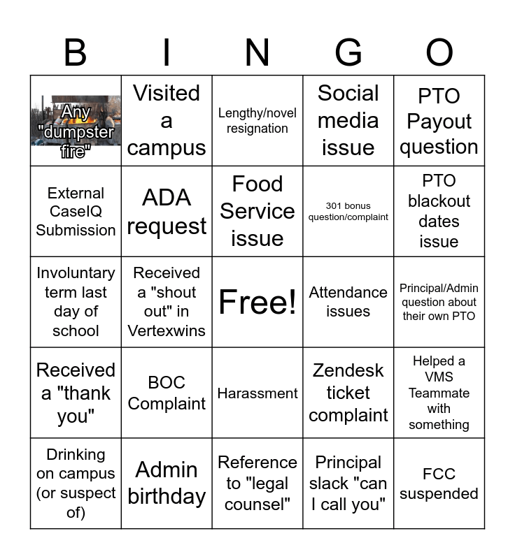 This bingo card has 1 images, a free space and 24 words: BOC Complaint, Admin birthday, Food Service issue, Drinking on campus (or suspect of), PTO Payout question, Any "dumpster fire", External CaseIQ Submission, Visited a campus, Attendance issues, Harassment, 301 bonus question/complaint, Involuntary term last day of school, Zendesk ticket complaint, Helped a VMS Teammate with something, ADA request, Principal slack "can I call you", Principal/Admin question about their own PTO, Lengthy/novel resignation, PTO blackout dates issue, Received a "shout out" in Vertexwins, FCC suspended, Received a "thank you", Social media issue and Reference to "legal counsel".