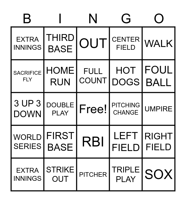 This bingo card has a free space and 50 words: CUBS, SOX, CATCHER, PITCHER, FIRST BASE, SECOND BASE, THIRD BASE, SHORT STOP, SACRIFICE FLY, BASE HIT, HOME RUN, CENTER FIELD, RIGHT FIELD, LEFT FIELD, BUNT, ERROR, FULL COUNT, PITCHING CHANGE, SEVENTH INNING STRETCH, WALK, DOUBLE PLAY, TRIPLE PLAY, EXTRA INNINGS, HOT DOGS, PEANUTS, FLY BALL, FOUL BALL, SAFE, OUT, RBI, LINE DRIVE, SINGLE, HOME RUN, GRAND SLAM, STRIKE OUT, POPCORN, STOLEN BASE, CALLED STRIKE, SWING AND MISS, UMPIRE, COACH, WALK, BALK, HOME PLATE, EXTRA INNINGS, 3 UP 3 DOWN, WILD PITCH, PRACTICE, WORLD SERIES and CHICAGO.