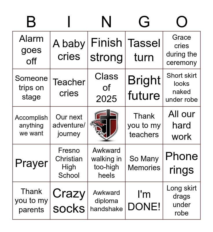 This bingo card has a free space and 24 words: Fresno Christian High School, Crazy socks, Class of 2025, Thank you to my parents, Grace cries during the ceremony, Alarm goes off, Someone trips on stage, A baby cries, Thank you to my teachers, Awkward walking in too-high heels, Bright future, Accomplish anything we want, So Many Memories, Phone rings, Teacher cries, I'm DONE!, All our hard work, Finish strong, Short skirt looks naked under robe, Our next adventure/ journey, Long skirt drags under robe, Prayer, Tassel turn and Awkward diploma handshake.