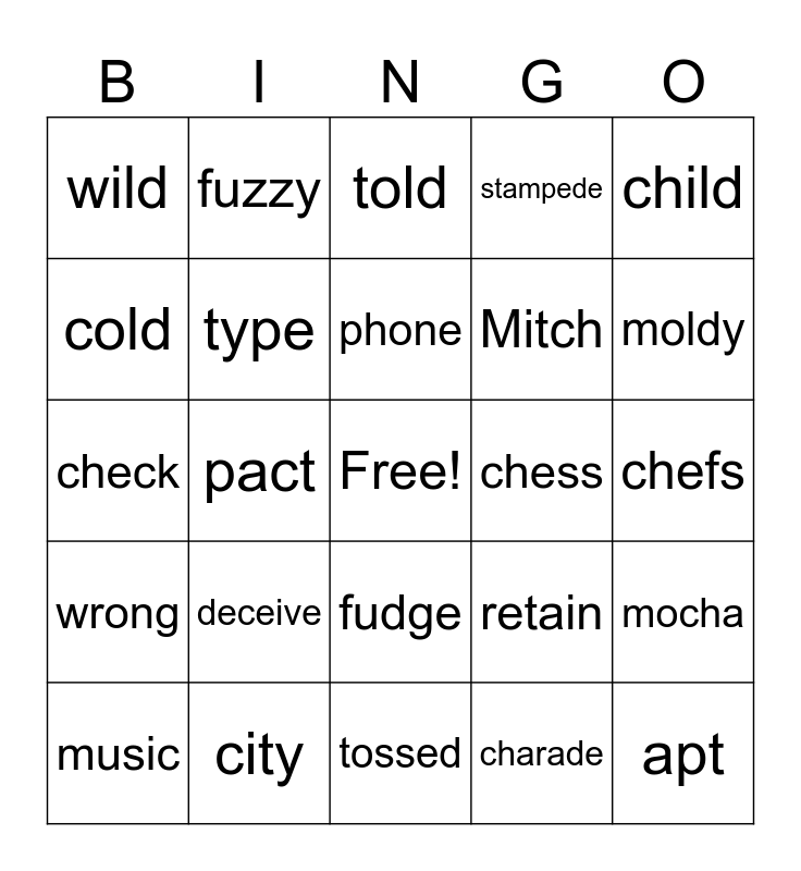 This bingo card has a free space and 24 words: deceive, city, phone, music, child, wild, cold, fuzzy, chess, fudge, Mitch, check, retain, mocha, type, charade, chefs, told, moldy, pact, apt, wrong, stampede and tossed.