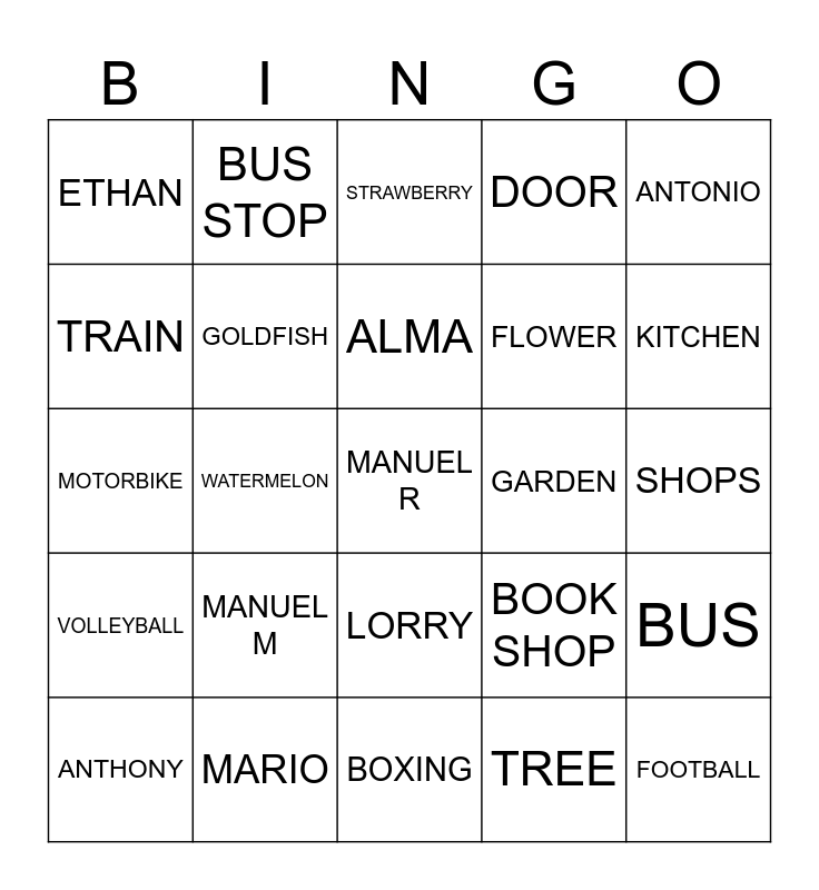 This bingo card has a free space and 24 words: MANUEL M, MARIO, ALMA, ANTHONY, ANTONIO, ETHAN, TRAIN, BUS STOP, GARDEN, LORRY, FLOWER, MOTORBIKE, BOOK SHOP, BUS, GOLDFISH, TREE, SHOPS, STRAWBERRY, KITCHEN, WATERMELON, FOOTBALL, VOLLEYBALL, DOOR and BOXING.