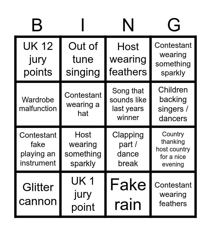 This bingo card has 24 words: Rapping, Song about love, Children backing singers / dancers, A song about peace, Wardrobe malfunction, UK 12 jury points, Contestant wearing a hat, Out of tune singing, UK 1 jury point, Verka Serduchka, Contestant fake playing an instrument, Clapping part / dance break, Wind machine, Technical issues (sound, light etc.), Song that sounds like last years winner, UK 5 jury points, Fake rain, Host wearing feathers, Host wearing something sparkly, Country thanking host country for a nice evening, Glitter cannon, Contestant wearing feathers, Contestant wearing something sparkly and Germany getting 12 jury points.
