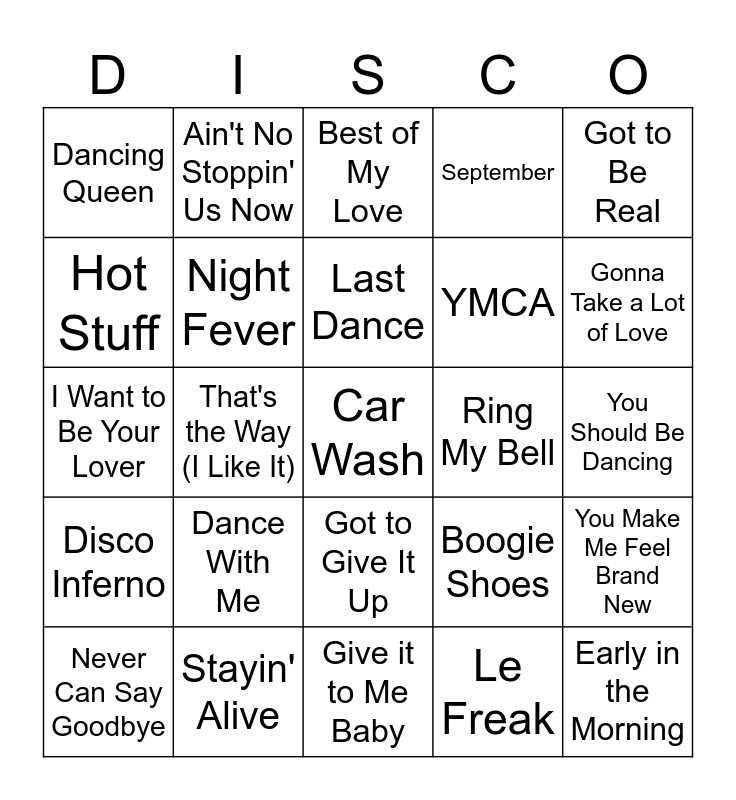 This bingo card has 61 words: Play That Funky Music, Stayin' Alive, I Will Survive, Disco Inferno, Le Freak, Don't Stop 'Til You Get Enough, Night Fever, I Love the Nightlife, YMCA, Boogie Wonderland, September, Get Down Tonight, Hot Stuff, Funkytown, Celebration, Dancing Queen, Car Wash, Got to Be Real, Shame, Last Dance, Ring My Bell, Best of My Love, Never Can Say Goodbye, You Make Me Feel Brand New, I Want Your Love, More Than a Woman, Turn the Beat Around, Upside Down, Gonna Take a Lot of Love, Do Ya Think I’m Sexy?, On the Radio, If I Can't Have You, Take Me Home, Let’s Groove, Ain't No Stoppin' Us Now, Superfreak, Forget Me Nots, That's the Way (I Like It), Keep It Comin' Love, I Want to Be Your Lover, Can’t Get Enough of Your Love, Babe, Dance With Me, You Should Be Dancing, Let’s Dance, Boogie Shoes, The Hustle, You Dropped a Bomb on Me, You Make Me Feel Mighty Real, It's Raining Men, Got to Give It Up, Give it to Me Baby, Rock Steady, Let It Whip, I Feel For You, We Are Family, Born to be Alive, Stomp, Brick House, And the Beat Goes On, Early in the Morning and Dazz.