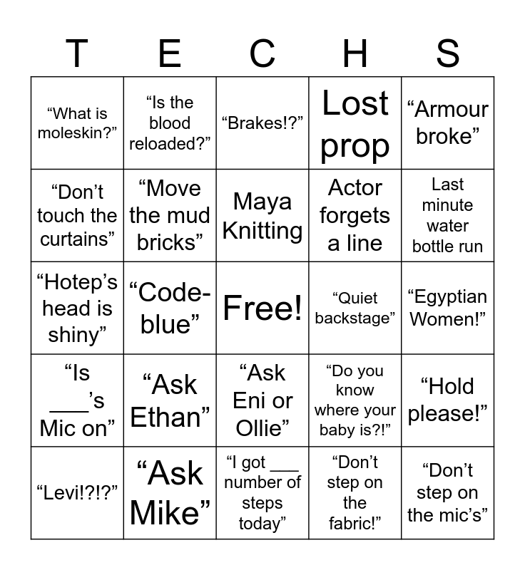 This bingo card has a free space and 24 words: “Ask Ethan”, “Ask Mike”, Maya Knitting, “Levi!?!?”, “Armour broke”, “What is moleskin?”, “Don’t touch the curtains”, “Is the blood reloaded?”, “Quiet backstage”, “Ask Eni or Ollie”, Actor forgets a line, “Hotep’s head is shiny”, “Do you know where your baby is?!”, “Hold please!”, “Move the mud bricks”, “Don’t step on the fabric!”, “Egyptian Women!”, “Brakes!?”, Last minute water bottle run, “Code-blue”, “Don’t step on the mic’s”, “Is ___’s Mic on”, Lost prop and “I got ___ number of steps today”.