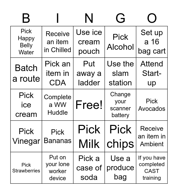 This bingo card has a free space and 24 words: Pick Bananas, Put on your lone worker device, Put away a ladder, Pick Strawberries, Set up a 16 bag cart, Pick Happy Belly Water, Batch a route, Receive an item in Chilled, Change your scanner battery, Pick Milk, Use the slam station, Pick ice cream, Pick chips, Receive an item in Ambient, Pick an item in CDA, Use a produce bag, Pick Avocados, Use ice cream pouch, Attend Start-up, Complete a WW Huddle, If you have completed CAST training, Pick Vinegar, Pick Alcohol and Pick a case of soda.