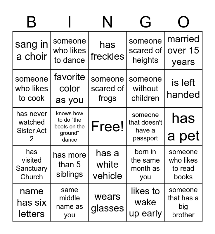 This bingo card has a free space and 29 words: name has six letters, has been out the country, knows how to do "the boots on the ground" dance, someone that's retired, sang in a choir, has freckles, favorite color as you, has more than 5 siblings, someone that doesn't have a passport, same middle name as you, has a pet, someone that has a big brother, wears glasses, likes to wake up early, is left handed, has been in a parade, has a white vehicle, has visited Sanctuary Church, married over 15 years, has never watched Sister Act 2, born in the same month as you, has a button on their shirt, someone without children, someone who likes to cook, someone scared of heights, someone who likes to dance, someone who likes to read books, someone scared of frogs and someone that can play a musical instrument.