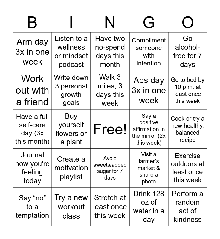 This bingo card has a free space and 24 words: Create a motivation playlist, Try a new workout class, Walk 3 miles, 3 days this week, Say “no” to a temptation, Go alcohol-free for 7 days, Arm day 3x in one week, Work out with a friend, Listen to a wellness or mindset podcast, Say a positive affirmation in the mirror (2x this week), Avoid sweets/added sugar for 7 days, Abs day 3x in one week, Have a full self-care day (3x this month), Visit a farmer’s market & share a photo, Exercise outdoors at least once this week, Write down 3 personal growth goals, Drink 128 oz of water in a day, Cook or try a new healthy, balanced recipe, Have two no-spend days this month, Go to bed by 10 p.m. at least once this week, Buy yourself flowers or a plant, Perform a random act of kindness, Journal how you're feeling today, Compliment someone with intention and Stretch at least once this week.