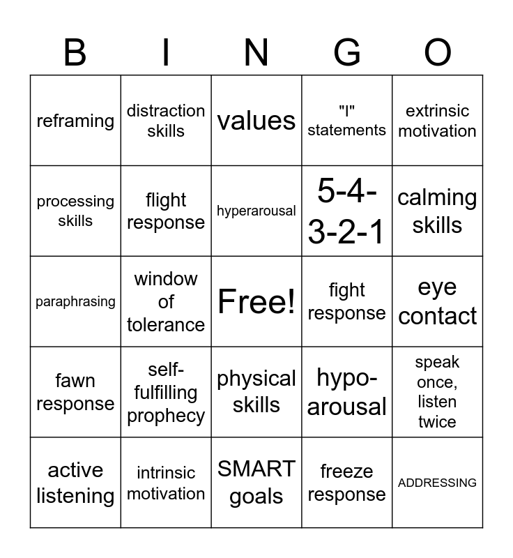 This bingo card has a free space and 24 words: self-fulfilling prophecy, intrinsic motivation, hyperarousal, active listening, extrinsic motivation, reframing, processing skills, distraction skills, fight response, physical skills, 5-4-3-2-1, paraphrasing, hypo-arousal, speak once, listen twice, flight response, freeze response, eye contact, values, calming skills, window of tolerance, ADDRESSING, fawn response, "I" statements and SMART goals.
