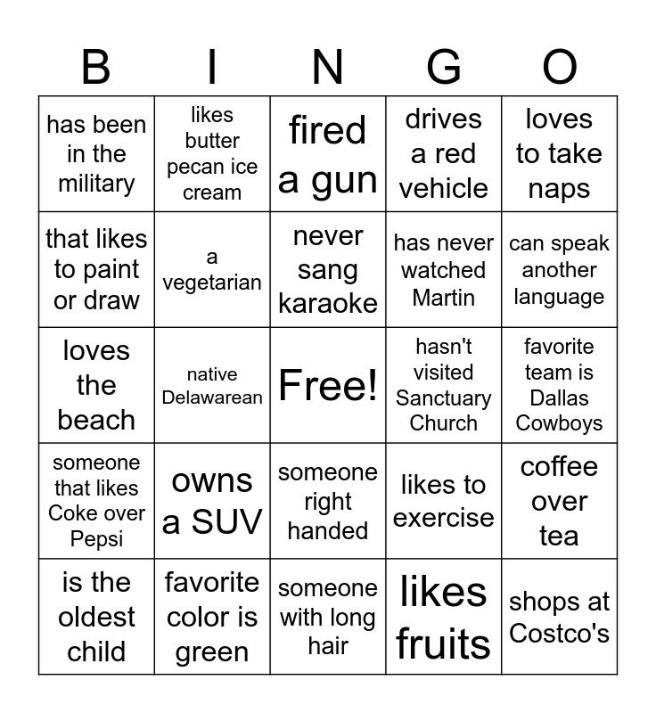 This bingo card has a free space and 29 words: is the oldest child, traveled to at least five states, native Delawarean, never been to school prom, has been in the military, fired a gun, a vegetarian, owns a SUV, hasn't visited Sanctuary Church, favorite color is green, favorite team is Dallas Cowboys, shops at Costco's, someone with long hair, likes fruits, can speak another language, loves to swim, someone right handed, someone that likes Coke over Pepsi, loves to take naps, loves the beach, likes to exercise, same first initial as you, has never watched Martin, that likes to paint or draw, drives a red vehicle, likes butter pecan ice cream, coffee over tea, never sang karaoke and has been ice skating.