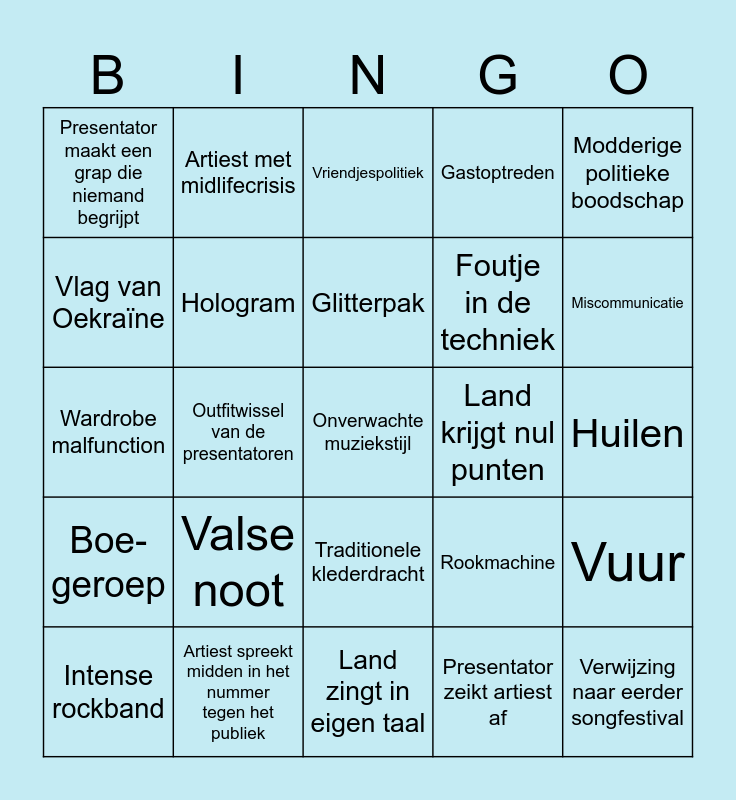 This bingo card has 25 words: Valse noot, Land zingt in eigen taal, Glitterpak, Intense rockband, Modderige politieke boodschap, Presentator maakt een grap die niemand begrijpt, Vlag van Oekraïne, Artiest met midlifecrisis, Land krijgt nul punten, Traditionele klederdracht, Foutje in de techniek, Wardrobe malfunction, Rookmachine, Vuur, Hologram, Verwijzing naar eerder songfestival, Huilen, Vriendjespolitiek, Miscommunicatie, Outfitwissel van de presentatoren, Onverwachte muziekstijl, Artiest spreekt midden in het nummer tegen het publiek, Boe-geroep, Gastoptreden and Presentator zeikt artiest af.