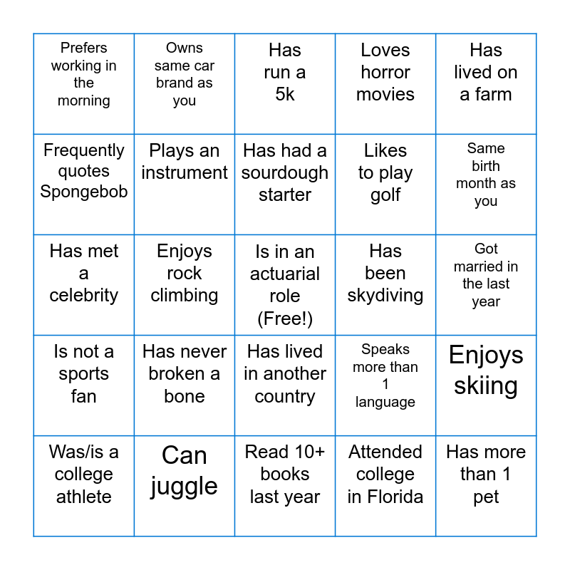 This bingo card has a free space and 45 words: Has never been to another country, Has more than 1 pet, Has never moved out of their home state, Was/is a college athlete, Can do a headstand, Attended college in Florida, Has run a 5k, Has attended yoga on Ophelia's dock, Has lived on a farm, Can juggle, Loves horror movies, Has been skydiving, Has lived in another country, Has never broken a bone, Has a tattoo, Read 10+ books last year, Has a favorite pen, Has met a celebrity, Loves true crime, Same birth month as you, Owns same car brand as you, Goes all-out on holiday decorating, Has been in a hot air balloon, Prefers working in the morning, Prefers working at night, Got married in the last year, Bought a house in the last year, Had a baby in the last year, Speaks more than 1 language, Is not a sports fan, Has been to a championship sports game, Enjoys skiing, Drives a car older than 15 years old, Would not quit working if they won a huge lottery, Had an emo/angsty phase, Enjoys rock climbing, Is into arts/crafts, Enjoys cooking, Favorite music decade is the 90s, Has had a sourdough starter, Frequently quotes Spongebob, Likes to play golf, Doesn't live in Florida or Colorado, Plays an instrument and Did their undergrad at Concordia University.