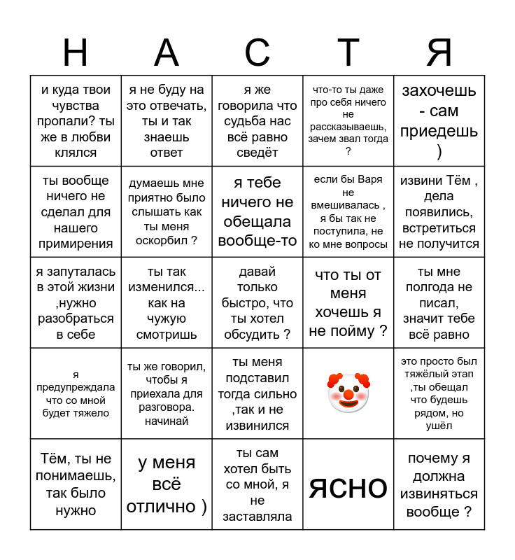 This bingo card has 25 words: ты же говорил, чтобы я приехала для разговора. начинай, ты сам хотел быть со мной, я не заставляла, я тебе ничего не обещала вообще-то, Тём, ты не понимаешь, так было нужно, захочешь - сам приедешь ), и куда твои чувства пропали? ты же в любви клялся, ты вообще ничего не сделал для нашего примирения, я не буду на это отвечать, ты и так знаешь ответ, что ты от меня хочешь я не пойму ?, ты меня подставил тогда сильно ,так и не извинился, если бы Варя не вмешивалась , я бы так не поступила, не ко мне вопросы, я запуталась в этой жизни ,нужно разобраться в себе, 🤡, это просто был тяжёлый этап ,ты обещал что будешь рядом, но ушёл, думаешь мне приятно было слышать как ты меня оскорбил ?, почему я должна извиняться вообще ?, ты мне полгода не писал, значит тебе всё равно, я же говорила что судьба нас всё равно сведёт, извини Тём , дела появились, встретиться не получится, ты так изменился... как на чужую смотришь, давай только быстро, что ты хотел обсудить ?, у меня всё отлично ), я предупреждала что со мной будет тяжело, что-то ты даже про себя ничего не рассказываешь, зачем звал тогда ? and ясно.