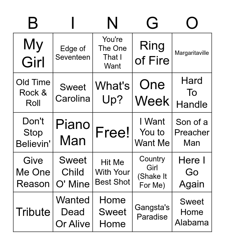 This bingo card has a free space and 41 words: Before He Cheats, Don't Stop Believin', Black Velvet, Sweet Carolina, Wanted Dead Or Alive, Hit Me With Your Best Shot, What's Up?, Total Eclipse of the Heart, Margaritaville, Give Me One Reason, Piano Man, Ring of Fire, Sweet Home Alabama, Son of a Preacher Man, I Want You to Want Me, Sweet Child O' Mine, Wonderwall, My Girl, Brown Eyed Girl, You're The One That I Want, Here I Go Again, Keep Your Hands to Yourself, Home Sweet Home, One Week, I'm A Believer, Mustang Sally, Gangsta's Paradise, Come Sail Away, Hard To Handle, All The Small Things, Gimme Three Steps, Edge of Seventeen, Tribute, It's All Coming Back to Me Now, Country Girl (Shake It For Me), Old Time Rock & Roll, My Sharona, Barracuda, HOT TO GO!, Shallow and Mamma Mia.