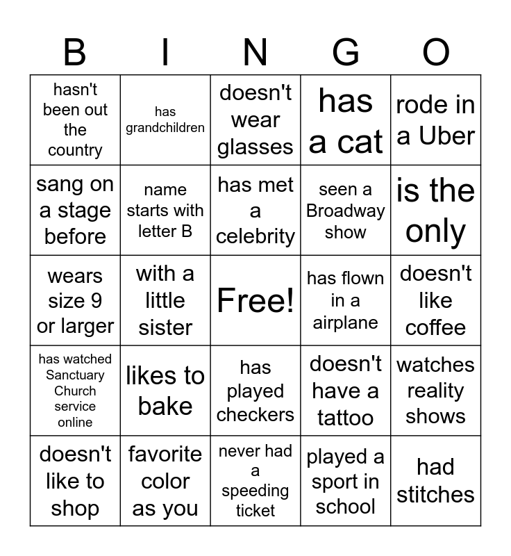 This bingo card has a free space and 29 words: doesn't like to shop, likes crabs, with a little sister, doesn't like to cook, hasn't been out the country, doesn't wear glasses, name starts with letter B, likes to bake, has flown in a airplane, favorite color as you, doesn't like coffee, had stitches, never had a speeding ticket, played a sport in school, is the only, wearing jeans, has played checkers, has watched Sanctuary Church service online, rode in a Uber, wears size 9 or larger, doesn't have a tattoo, favorite team is Pittsburgh Steelers, seen a Broadway show, sang on a stage before, has a cat, has grandchildren, watches reality shows, has met a celebrity and has been hiking.