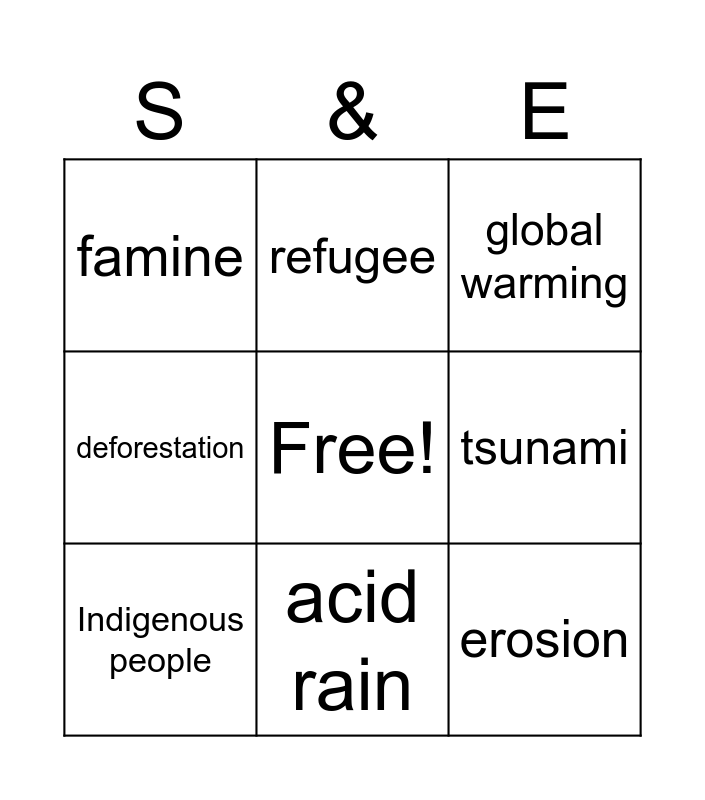 This bingo card has a free space and 9 words: Indigenous people, global warming, refugee, deforestation, famine, tsunami, erosion, epidemic and acid rain.