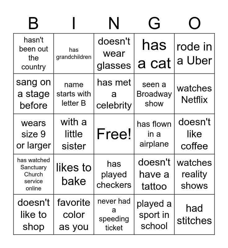 This bingo card has a free space and 29 words: doesn't like to shop, likes crabs, with a little sister, doesn't like to cook, hasn't been out the country, doesn't wear glasses, name starts with letter B, likes to bake, has flown in a airplane, favorite color as you, doesn't like coffee, had stitches, never had a speeding ticket, played a sport in school, watches Netflix, wearing jeans, has played checkers, has watched Sanctuary Church service online, rode in a Uber, wears size 9 or larger, doesn't have a tattoo, favorite team is Pittsburgh Steelers, seen a Broadway show, sang on a stage before, has a cat, has grandchildren, watches reality shows, has met a celebrity and has been hiking.