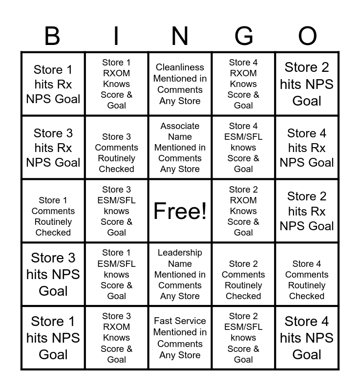 This bingo card has a free space and 24 words: Store 1 hits NPS Goal, Store 1 ESM/SFL knows Score & Goal, Associate Name Mentioned in Comments Any Store, Store 2 ESM/SFL knows Score & Goal, Store 2 hits NPS Goal, Store 1 hits Rx NPS Goal, Store 1 RXOM Knows Score & Goal, Cleanliness Mentioned in Comments Any Store, Store 2 RXOM Knows Score & Goal, Store 2 hits Rx NPS Goal, Store 1 Comments Routinely Checked, Store 3 Comments Routinely Checked, Store 2 Comments Routinely Checked, Store 4 Comments Routinely Checked, Store 3 hits Rx NPS Goal, Store 3 RXOM Knows Score & Goal, Fast Service Mentioned in Comments Any Store, Store 4 RXOM Knows Score & Goal, Store 4 hits Rx NPS Goal, Store 3 hits NPS Goal, Store 3 ESM/SFL knows Score & Goal, Leadership Name Mentioned in Comments Any Store, Store 4 ESM/SFL knows Score & Goal and Store 4 hits NPS Goal.