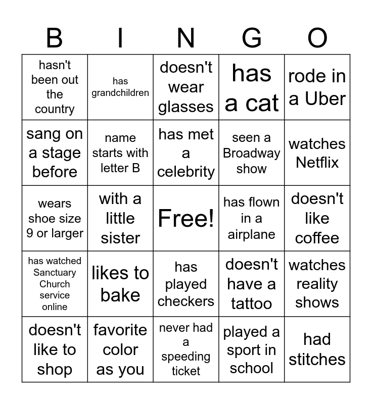 This bingo card has a free space and 29 words: doesn't like to shop, likes crabs, with a little sister, doesn't like to cook, hasn't been out the country, doesn't wear glasses, name starts with letter B, likes to bake, has flown in a airplane, favorite color as you, doesn't like coffee, had stitches, never had a speeding ticket, played a sport in school, watches Netflix, wearing jeans, has played checkers, has watched Sanctuary Church service online, rode in a Uber, wears shoe size 9 or larger, doesn't have a tattoo, favorite team is Pittsburgh Steelers, seen a Broadway show, sang on a stage before, has a cat, has grandchildren, watches reality shows, has met a celebrity and has been hiking.