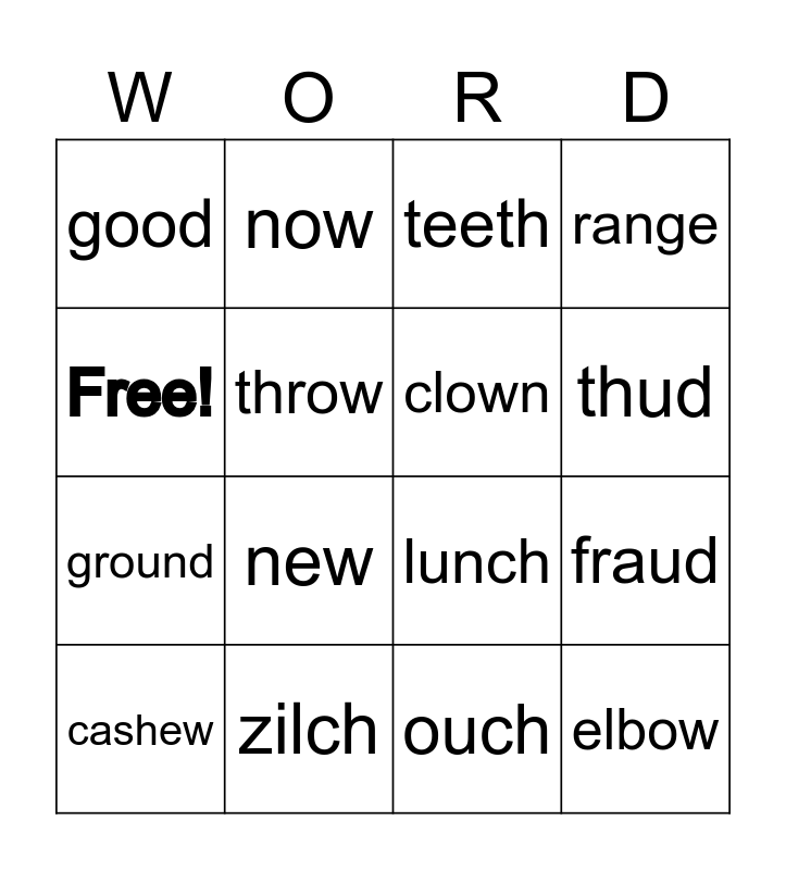 This bingo card has 16 words: zilch, fraud, teeth, good, ground, now, lunch, ouch, Free!, throw, cashew, range, new, thud, clown and elbow.
