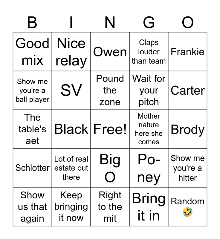 This bingo card has a free space and 24 words: Lot of real estate out there, Keep bringing it now, Pound the zone, Show us that again, Frankie, Good mix, Show me you're a ball player, Nice relay, Mother nature here she comes, Big O, Wait for your pitch, The table's aet, Po-ney, Show me you're a hitter, SV, Bring it in, Brody, Owen, Carter, Black, Random 🤣, Schlotter, Claps louder than team and Right to the mit.
