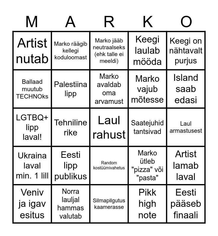 This bingo card has 33 words: Eesti pääseb finaali, Poola ei saa edasi, Tehniline rike, Laval on FIRE, Ukraina laval min. 1 lill, Palestiina lipp, Keegi on nähtavalt purjus, Veniv ja igav esitus, Marko räägib kellegi koduloomast, Marko mainib kuulujutte (räägitakse et...), Marko avaldab oma arvamust, Marko jääb neutraalseks (ehk talle ei meeldi), Keegi võtab särgi ära, Saatejuhid teevad lolli nalja, Saatejuhid tantsivad, Island saab edasi, Norra lauljal hammas valutab, LGTBQ+ lipp laval!, Eesti lipp publikus, Marko ütleb "pizza" või "pasta", Random kostüümivahetus, Tants sünkroonist väljas, Artist nutab, Laul armastusest, Silmapilgutus kaamerasse, Laul rahust, Keegi laulab mööda, Marko vajub mõtesse, Ballaad muutub TECHNOks, Artist lamab laval, Crazy long nails, Pikk high note and Marko ütleb "Toomas Sularaha".