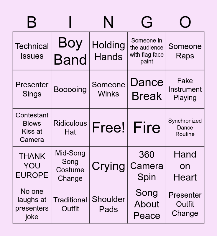 This bingo card has a free space and 39 words: Song About Love, Smoke Machine, Ridiculous Outfit, Booooing, No one laughs at presenters joke, Crying, Someone Winks, Song is in native language, Someone Raps, THANK YOU EUROPE, Ridiculous Hat, Someone in the audience with flag face paint, Presenter Outfit Change, Synchronized Dance Routine, Fire, Mid-Song Song Costume Change, Costume with Feathers, Technical Issues, Contestant Looks Very Young, 360 Camera Spin, Presenter Sings, Shoulder Pads, Dance Break, Fake Instrument Playing, Wind Machine, Fake Rain, Topless Performer, Singing out of Tune, Solo Performer, Boy Band, Live Instruments, Rainbow Flag, Holding Hands, Traditional Outfit, Song About Peace, Audience Sings Along, Hand on Heart, Contestant Blows Kiss at Camera and Sequins.