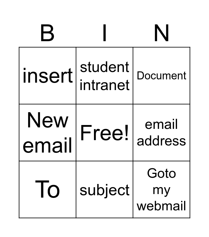 This bingo card has a free space and 14 words: Email, BCC, To, student intranet, New email, Goto my webmail, CC, Add subject, subject, insert, Send, email address, Document and Attach.