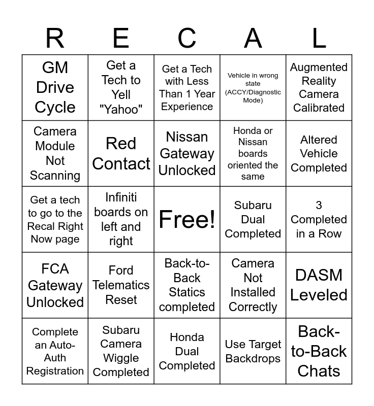 This bingo card has a free space and 31 words: Honda Dual Completed, Subaru H/C Test Completed, Infiniti boards on left and right, Connect Battery Support, GM Drive Cycle, Get a Tech with Less Than 1 Year Experience, Red Contact, Camera Not Installed Correctly, Subaru Dual Completed, Use Target Backdrops, 3 Completed in a Row, Back-to-Back Chats, DTC Check Call Only-Proceed, Get a Tech with More Than 10 Years' Experience, Altered Vehicle Completed, 94%er Completed, DASM Leveled, Ford Telematics Reset, FCA Gateway Unlocked, Back-to-Back Statics completed, Augmented Reality Camera Calibrated, Tablet Restart, Complete an Auto-Auth Registration, Get a Tech to Yell "Yahoo", Honda or Nissan boards oriented the same, Camera Module Not Scanning, Vehicle in wrong state (ACCY/Diagnostic Mode), Get a tech to go to the Recal Right Now page, Subaru Camera Wiggle Completed, Nissan Gateway Unlocked and Volvo Recharge "Active Mode".