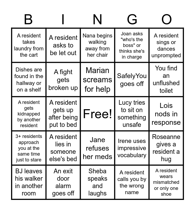 This bingo card has a free space and 24 words: A resident lies in someone else's bed, An exit door alarm goes off, Marian screams for help, BJ leaves his walker in another room, A resident sings or dances unprompted, A resident takes laundry from the cart, Dishes are found in the hallway or on a shelf, A resident asks to be let out, Lucy tries to sit on something unsafe, Jane refuses her meds, SafelyYou goes off, A resident gets kidnapped by another resident, Irene uses impressive vocabulary, Roseanne gives a resident a hug, A fight gets broken up, A resident calls you by the wrong name, Lois nods in response, Nana begins walking away from her chair, You find an unflushed toilet, A resident gets up after being put to bed, A resident wears mismatched or only one shoe, 3+ residents approach you at the same time just to stare, Joan asks "who's the boss" or thinks she's in charge and Sheba speaks and laughs.