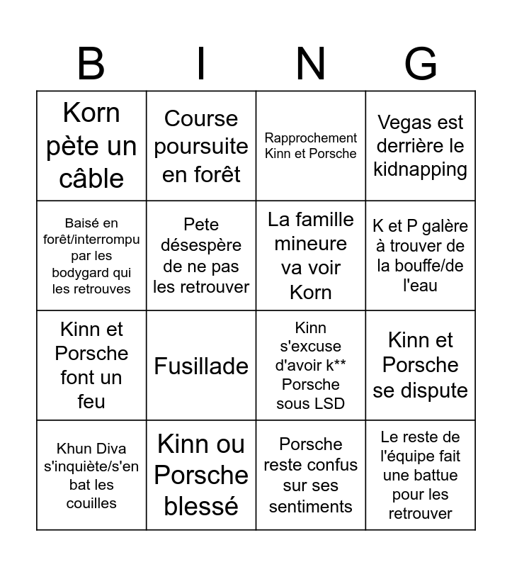 This bingo card has 16 words: Kinn ou Porsche blessé, Kinn et Porsche se dispute, Rapprochement Kinn et Porsche, Korn pète un câble, Kinn et Porsche font un feu, Course poursuite en forêt, Kinn s'excuse d'avoir k** Porsche sous LSD, Porsche reste confus sur ses sentiments, Baisé en forêt/interrompu par les bodygard qui les retrouves, Pete désespère de ne pas les retrouver, Khun Diva s'inquiète/s'en bat les couilles, Vegas est derrière le kidnapping, Fusillade, K et P galère à trouver de la bouffe/de l'eau, La famille mineure va voir Korn and Le reste de l'équipe fait une battue pour les retrouver.