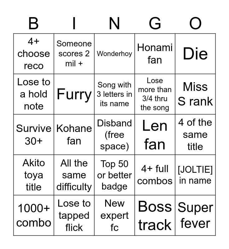 This bingo card has a free space and 44 words: Player with three matching titles, Super fever, Someone gets an AP master, 1000+ combo, 2 or more dc, Boss track, Wonderhoy, Full combo minus 1, Die, Lose to tapped flick, Honami fan, Len fan, Top 50 or better badge, All the same difficulty, All different difficulties, New expert fc, New ap, Survive 30+, Full sheet, Miss S rank, Someone scores 2 mil +, 2 or more die (not counting dc), 2 songs on ur playlist in a row, 4+ choose reco, Same song twice in a row, 4 of the same title, 100+ master fc title, 5+ master ap title, 4+ full combos, Akito toya title, Saki birthday title, [JOLTIE] in name, "flick" in name, Something gay in name, Kohane fan, 10M+ combined score, Someone gets superstar, MVP, Song with 3 letters in its name, Lose to a hold note, Lose more than 3/4 thru the song, Two fcs in a row, Furry and All titles are unique.
