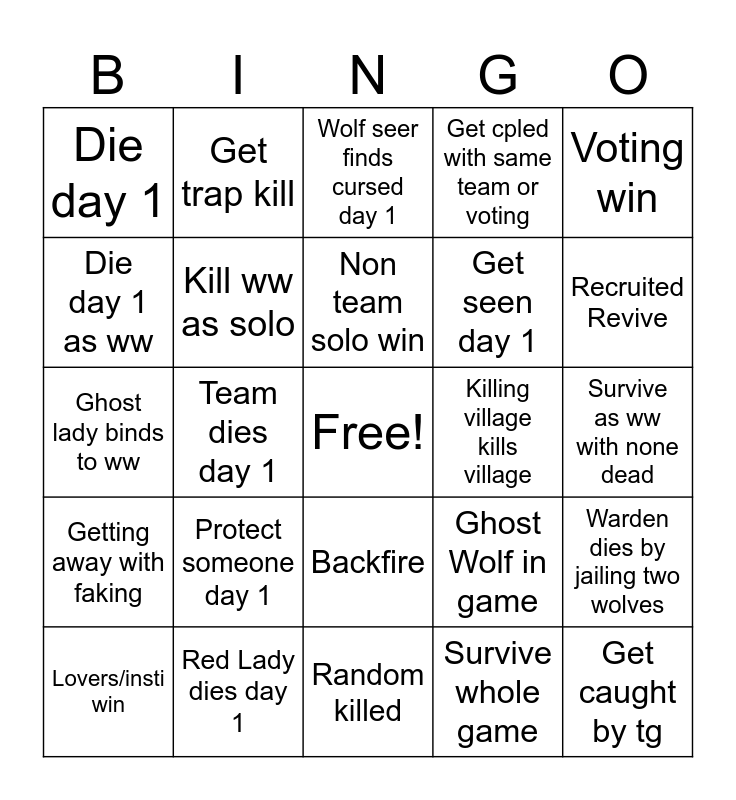 This bingo card has a free space and 24 words: Protect someone day 1, Red Lady dies day 1, Non team solo win, Lovers/insti win, Voting win, Die day 1, Die day 1 as ww, Get trap kill, Killing village kills village, Backfire, Get seen day 1, Ghost lady binds to ww, Ghost Wolf in game, Warden dies by jailing two wolves, Kill ww as solo, Survive whole game, Survive as ww with none dead, Wolf seer finds cursed day 1, Recruited Revive, Team dies day 1, Get caught by tg, Getting away with faking, Get cpled with same team or voting and Random killed.