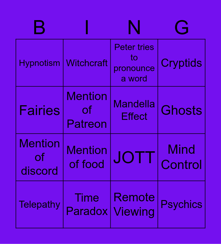 This bingo card has 41 words: Segway!, JOTT, Ben talks about cheese, Mandella Effect, Extra Terrestrial, Drones, Ghosts, Time Travel, Fairies, Psychics, Mind Control, Cryptids, Telepathy, Remote Viewing, Time Paradox, Alternate Reality, Conspiracy Theory, Hypnotism, Religion, Peter tries to pronounce a word, Peter tries to pronounce a name, Peter/Ben reference a tv show, Peter/Ben reference a movie, Mention of discord, A new patreon!, Ben references Fourtean Times, Dog Interruption!, Snoring dog!, Mention of food, Someone makes a pun, Someone makes a dad joke, Witchcraft, Dimensions, Reptilians, Portals, Mention of Patreon, Mention of Extra Scoop, Technology, Politics, Mention of the pub and Peter's random facts.