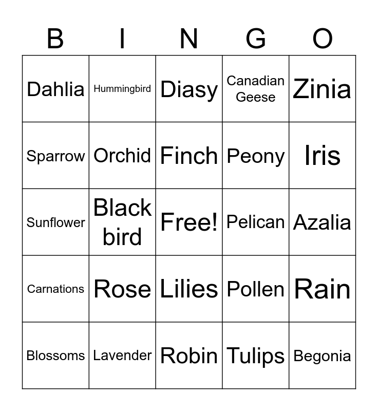 This bingo card has a free space and 24 words: Rose, Lavender, Finch, Blossoms, Zinia, Dahlia, Sparrow, Hummingbird, Pelican, Lilies, Peony, Sunflower, Pollen, Rain, Orchid, Tulips, Azalia, Diasy, Iris, Black bird, Begonia, Carnations, Canadian Geese and Robin.