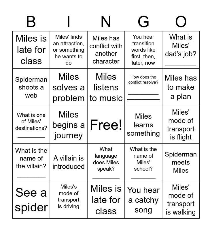 This bingo card has a free space and 29 words: See a spider, Miles meets spiderman, Miles begins a journey, Miles arrives at a destination, Miles is late for class, Miles has conflict with another character, Miles solves a problem, A villain is introduced, Miles learns something, Miles's mode of transport is driving, Miles' mode of transport is flight, Miles' mode of transport is walking, Miles is late for class, You hear a catchy song, Miles has to make a plan, Miles makes a friend, What language does Miles speak? _________, What is the name of the villain? ________, What is Miles' dad's job? ________, What is one of Miles' destinations? _________, What is the name of Miles' school? ________, What is one conflict in the movie? _____________, How does the conflict resolve? _____________ ______________, Spiderman shoots a web, You hear transition words like first, then, later, now, Miles' finds an attraction, or something he wants to do, Spiderman meets Miles, Miles listens to music and Miles is in his room.